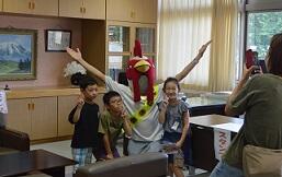 子どもたちはオブチキに大喜び! 握手をしたり、記念写真を撮ったりしました。
