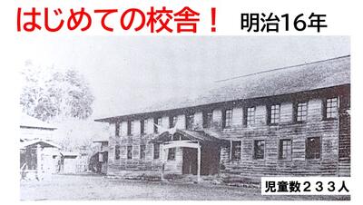 地域の方の寄付などで建てられた初めての「校舎」の写真を見せながら、