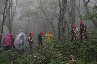 あいにくの小雨で、霧のため視界も悪かったのですが、ブナの若木を探す活動を行ってきました。