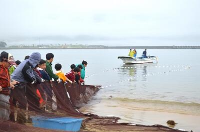 午後は、うみねこ丸に乗船してカモメの餌付け体験をしたあと、地引網体験も行いました。