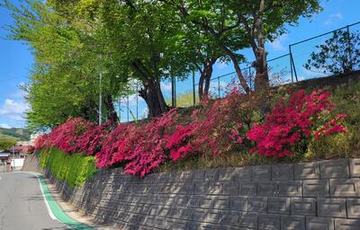 正門を出て右に下がっていく道のところには、ツツジが満開です。
