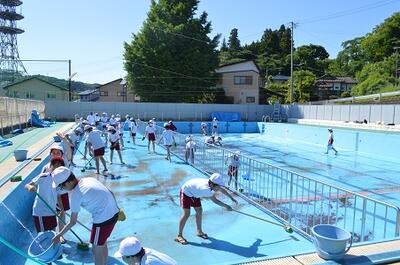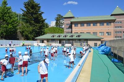 天気に恵まれ、晴天の下でプール清掃を行いました。
